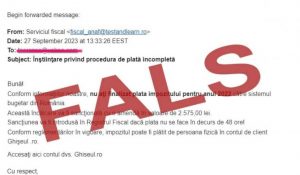 „Vă informăm că am fost înștiințați de către contribuabili că au primit mesaje false în numele ANAF, transmise de la adresa „Serviciul fiscal: fiscal_anaf@testandlearn.ro”, prin care sunt avertizați că nu au finalizat plata impozitului pentru anul 2022 și că „vor fi sancționați cu amenda de 2.575 lei, dacă nu efectuează plata în decurs de 48 de ore!