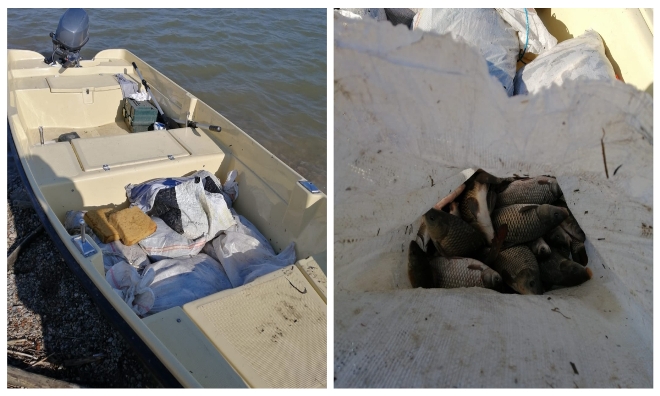 De asemenea, în urma verificării ambarcațiunii, a fost descoperită cantitatea de 96 kilograme pește, din specia caras, în stare proaspătă, pentru care persoanele în cauză nu au putut prezenta documente legale, precum și o plasă monofilament și un prostovol, unelte interzise la deținere.