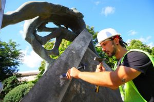 După lucrările de la Monumentul Eroilor Reg. 13 Artilerie „VULTURUL” din Parc Tomis II, de la Monumentul Eroilor „INDEPENDENȚA” și de la Obeliscul din Parcul Casei de Cultură, zilele acestea a fost demarată recondiționarea statuii „Căderea de pe soclu“, realizată de sculptorul Dimitrie Cuşa. Amplasată în anul 1999, în Parcul Arheologic de revoluţionarii constănţeni şi Primăria Municipiului Constanţa cu prilejul aniversării a zece ani de la revoluţia din 1989, opera de artă avea nevoie de preconsolidarea suprafețelor, îndepărtarea sărurilor, a chiturilor, retușare cromatică, tencuirea soclului și consolidarea suprafețelor.