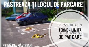Taxa pentru locul de parcare în Năvodari trebuie achitată până la data de 31 martie 2023 Pentru a putea beneficia în continuare de rezervarea unui loc de parcare, vă reamintim că este necesar să #achitați taxa aferentă până la data de 31 #martie 2023. Foarte important: #neachitarea taxei de închiriere …