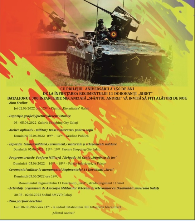 Cu prilejul aniversării a 150 de ani de la înființarea Regimentului 11 Dorobanți „Siret”, Batalionul 300 Infanterie Mecanizată „Sfântul Andrei”, continuatorul istoriei și tradițiilor de luptă ale marii unități, organizează cu sprijinul autorităților publice locale și asociațiilor militare gălățene o serie de activități cultural-educative cu caracter evocator și științific, expoziții de picturi/desene istorice, concert de muzică militară, expoziție de tehnică, armament și echipamente militare precum și ceremonii militare specifice în garnizoana Galați (comuna  Oancea și municipiul Galați), după următorul program: