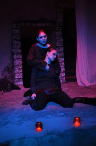 Din distribuţie fac parte studenți și cadre didactice ale Facultății de Arte: Daniela Vitcu (Claudius), Cătălina Popescu (Hamlet), Mirabela Moroşanu (Polonius), Cosmina Soare (Horaţio), Elena Bondari (Laertes), Ioana Chelmuş (Rosencratz), Dana Cojan (Guildenstern), Radu Niculescu (Duhul), Clara Ghiuvelechian (Gertrude), Arina Cojocaru (Ofelia), Ana – Maria Ştefan (al doilea gropar/al doilea actor). Scenografia este realizată de Mihail Alexandrescu.