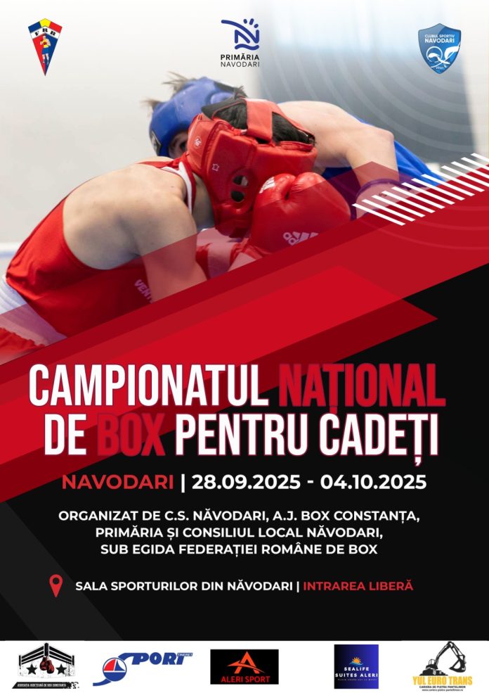 În perioada 28 septembrie – 4 octombrie 2025, Sala Sporturilor din Năvodari va găzdui Campionatul Național de Box Cadeți – Faza Finală, competiție organizată de Clubul Sportiv Năvodari și Asociația Județeană de Box Constanța, sub egida Federației Române de Box, în parteneriat cu Primăria Orașului Năvodari și Consiliul Local Năvodari.