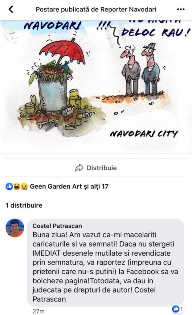 Iar furtul de proprietate intelectuală este la fel ca orice alt furt: și-a însușit bunuri/ creații care nu îi aparțineau și nu avea niciun drept asupra lor. Autorul caricaturilor, C. P., a notificat public pagina Reporter de Năvodari să șteargă imediat caricaturile publicate, anunțând totdată că va da în judecată autorii acestei pagini pentru drepturi de autor: „Am văzut că-mi măcelăriți caricaturile și vă semnați!