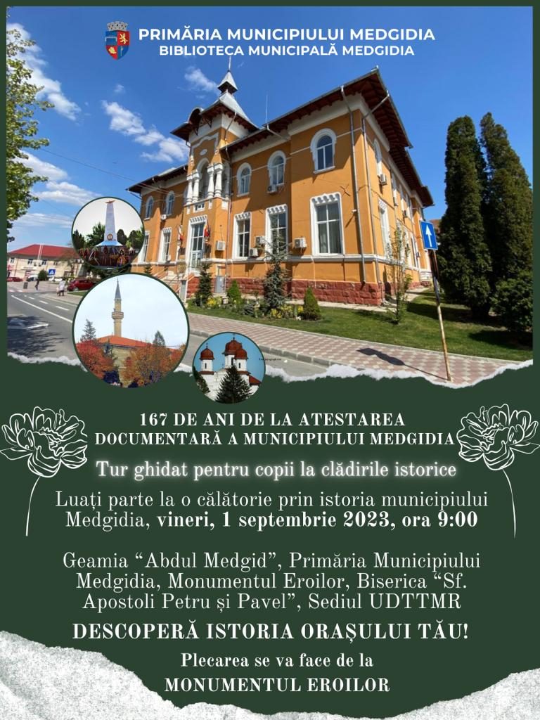 Cu ocazia împlinirii a 167 de ani de la atestarea documentară a localității, Primăria Medgidia îi invită pe toți copiii din municipiu la un tur ghidat al clădirilor istorice. Evenimentul se va desfășura vineri, 1 septembrie, începând cu ora 9.00, iar plecarea are loc de la Monumentul Eroilor.