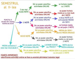 - Dacă media primului semestru este mai mică decât 5 și se poate valorifica activitatea on-line, atunci media semestrului al II-lea poate fi încheiată cu cel puțin două note.