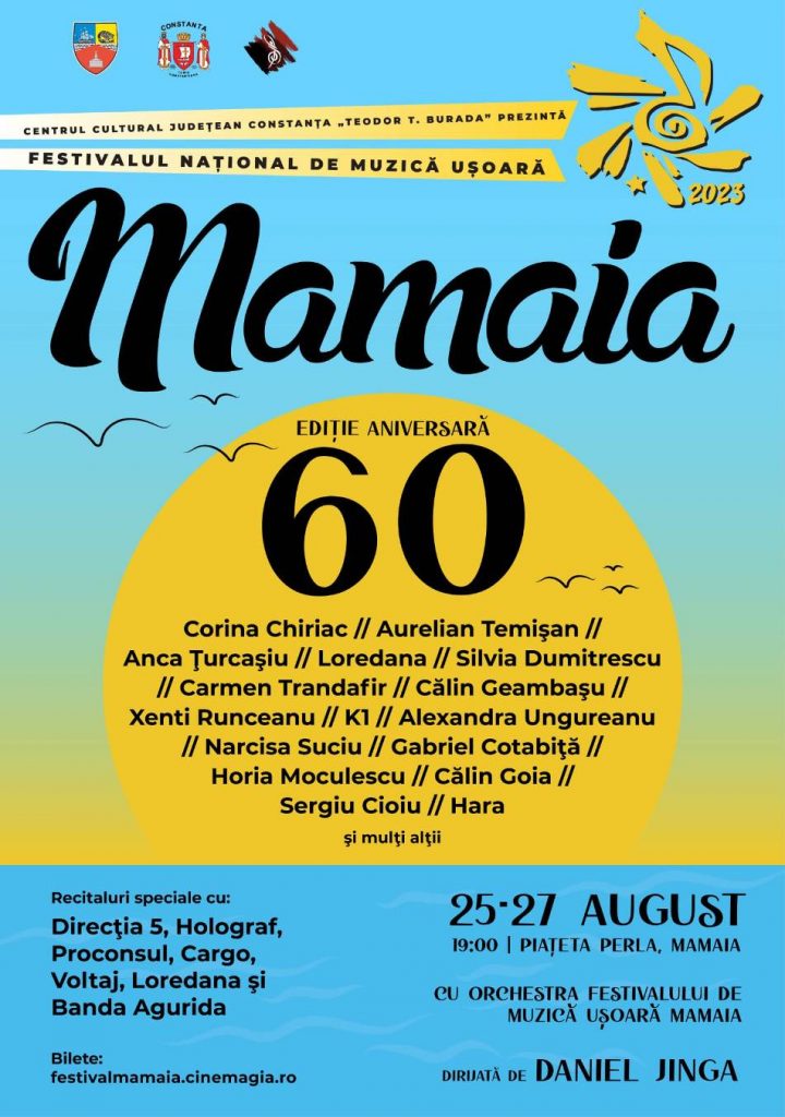 După 11 ani de absență,Festivalul Național de Muzică Ușoară ,,Mamaia” revine în atenția publicului autohton cu o ediție jubiliară, care va marca împlinirea a 60 de ani de la lansare. Iubitorii muzicii ușoare românești sunt așteptați, în zilele de 25, 26 și 27 august 2023, ora 19:00, în Piațeta Perla din stațiunea Mamaia, la evenimentul aniversar organizat de Centrul Cultural Județean Constanța ,,Teodor T. Burada”, în parteneriat cu Consiliul Județean Constanța și Primăria Municipiului Constanța.