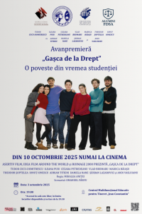 Universitatea Ovidius din Constanța, prin Facultatea de Arte, respectiv Facultatea de Drept și Științe Administrative organizează, în parteneriat cu Centrul Cultural Județean Constanța „Teodor T. Burada”, proiecția filmului „Gașca de la Drept”. Filmul va fi difuzat în avanpremieră, vineri, 3 octombrie 2025, de la ora 19.30, la Centrul Multifuncțional Educativ pentru Tineret „Jean Constantin”. Accesul în sală este gratuit, în limita locurilor disponibile.