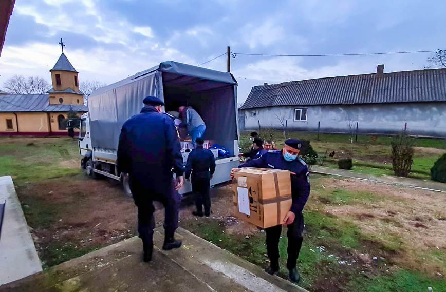 Apoi, camionul s-a oprit la școala din localitate, unde cei 26 de copii de vârste școlare și preșcolare, au avut parte de o recreație mare cu surprize: fiecare a primit un dar din partea jandarmilor.