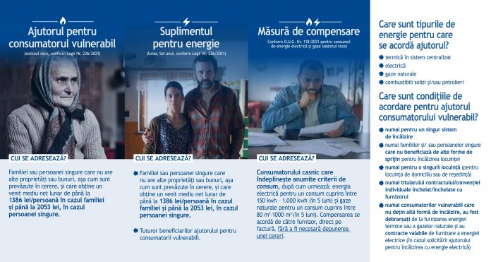 Informații despre ajutoarele oferite consumatorilor vulnerabili sunt disponibile și în pliantul realizat de către Ministerul Muncii și Protecției Sociale.