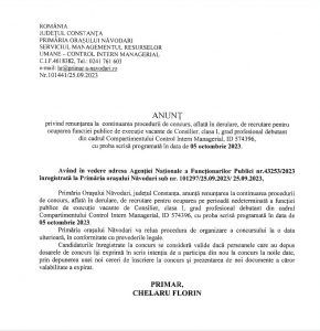 NAVODARI: ANUNȚ renunțare la continuarea procedurii de concurs pentru ocuparea funcției publice de consilier, clasa I, grad profesional debutant din data de 05 octombrie 2023 (proba scrisă)