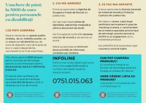 [3]Informații suplimentare referitorare la proiectul ”Facilitarea inserției pe piața muncii a persoanelor cu dizabilități” puteți obține sunând la INFOLINE TEHNOLOGIE ASISTIVĂ: 0751.015.063 (între orele 12.00-14.00) și accesând site-ul Autorității Naționale pentru Drepturile Persoanelor cu Dizabilități, Copii și Adulți – secțiunea ”Tehnologie asistivă”: http://andpdca.gov.ro/w/tehnologia-asistiva/ [4]