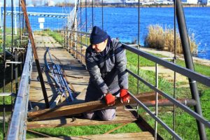 Angajații Direcției Gestionare Servicii Publice din cadrul Primăriei Municipiului Constanța au început săptămâna trecută lucrările de reparații la podețul suspendat aflat în apropierea Lacului Tăbăcărie. Muncitorii înlocuiesc elementele metalice degradate, curăță și vopsesc toate componentele metalice, schimbă podina din lemn degradată și refac tencuiala elementelor din beton.