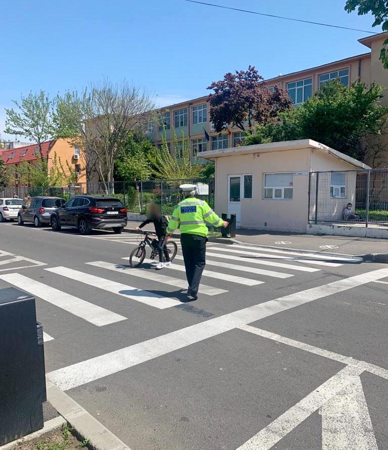 Polițiștii locali cu atribuții privind circulația rutieră acționează în proximitatea instituțiilor de învățământ pentru a asigura fluența traficului rutier și pietonal.