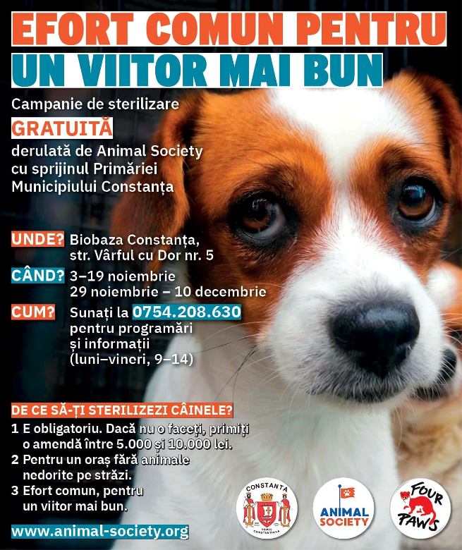 Primăria Municipiului Constanța și Animal Society continuă proiectul „Efort Comun pentru un viitor mai bun“ – ultima campanie de sterilizare gratuită din 2021 începe pe 3 noiembrie
