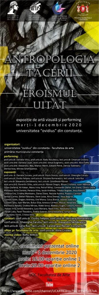 După-amiază, începând cu ora 16.00, va avea loc un eveniment cultural-artistic online pregătit și coordonat de Universitatea Ovidius din Constanța, prin Facultatea de Arte, cu titlul sugestiv “Antropologia tăcerii. Eroismul uitat” – expoziţie tematică şi performing cultural. Evenimentul va miza pe percepții artistice hibride generate de grafică, desen tematic, dans, muzică și poezie. Ziua Naţională este astfel celebrată cu ajutorul unui summum cultural dinamic, care va înlesni înţelegerea individuală și publică a semnificației Zilei Naționale dincolo de clişeele tradiționale. Intenția artistică este de a transmite publicului, fie și online, emoţiile care însoțesc semnificaţiile acestei zile atât de importante pentru România. Participanţi acestui performing sunt profesorii şi studenţii specializărilor Teatru, Coregrafie şi Pedagogia Artelor Plastice şi Decorative şi EVSPF, ciclurile Licenţă şi Master, de la Facultatea de Arte a Universității.