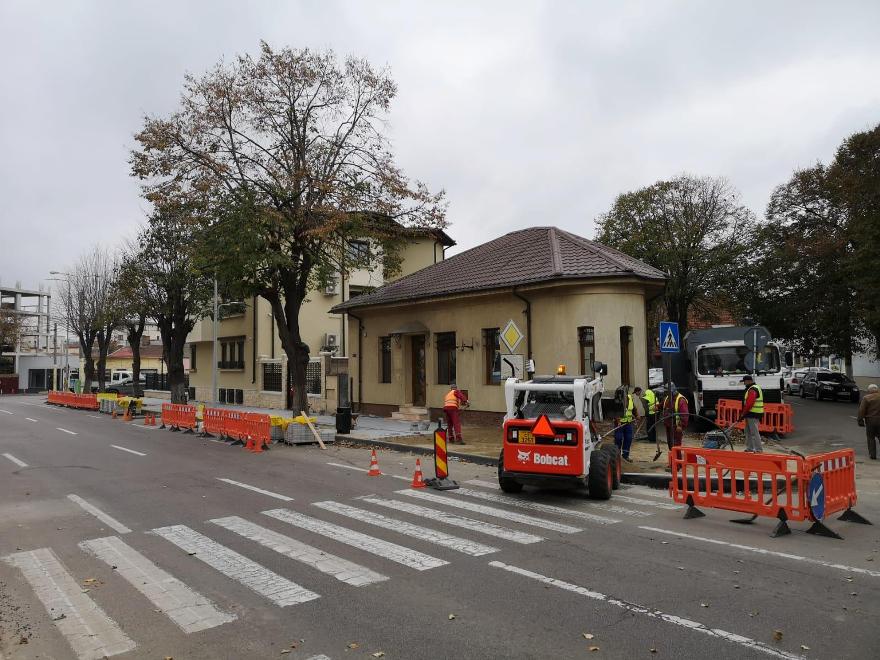 După ce în zonă au fost montate borduri moderne, trotuarele decopertate sunt refăcute cu pavele.