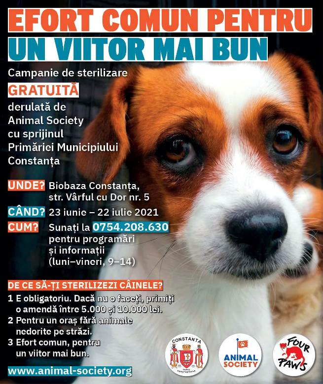 Primăria Municipiului Constanța, în parteneriat cu Animal Society și Four Paws International, continuă proiectul „Efort comun pentru un viitor mai bun“. A doua campanie de sterilizare gratuită a animalelor de rasă comună din oraș a început astăzi și se va derula până pe 22 iulie 2021.