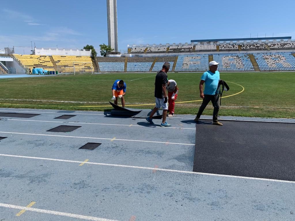 Se reabilitează pista de atletism din cadrul Complexului Sportiv “Gheorghe Hagi”. Bucățile deteriorate au fost decopertate și a început turnarea primului strat de mixtură neagră.