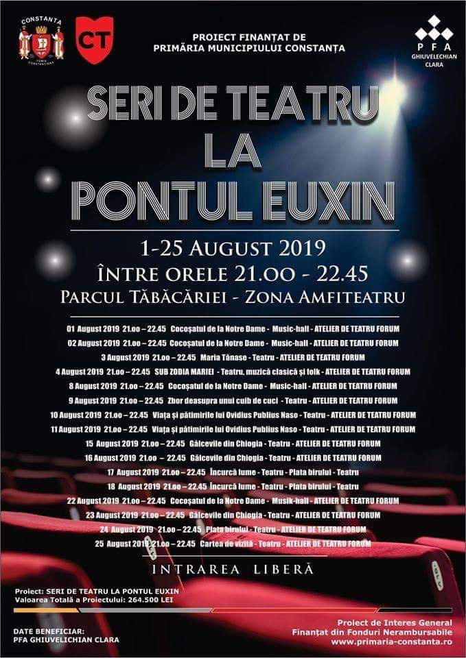 Până pe 25 august, stagiunea estivală „Seri de teatru la Pontul Euxin“, un proiect inițiat de Ghiuvelichian Clara PFA și finanțat de Primăria Municipiului Constanța, prezintă publicului constănțean spectacole de mare succes din dramaturgia românească și universală, săptămânal (joi, vineri, sâmbătă și duminică), în Amfiteatrul din Parcul Tăbăcărie.