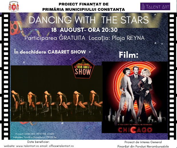 Joi, 18 august, Direcția de Cultură, Educație, Sport, Turism din cadrul Primăriei Municipiului Constanța și Asociația Talent-Art Constanța vă invită la o nouă ediție „Dancing with the stars”.  De la ora 20:30, vă puteți delecta cu spectacolul de dans „Cabaret Show” și puteți viziona producția „Chicago”, pe plaja Reyna din cartierul Faleză Nord.