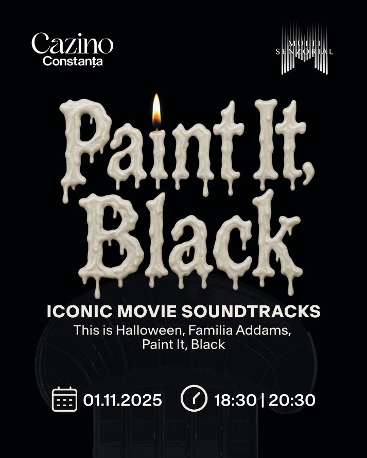 Sâmbătă, 1 noiembrie, Cazinoul din Constanța vă invită la o seară de Halloween cu totul specială: în penumbra elegantă a Cazinoului, luminile se vor stinge pentru a lăsa locul lumânărilor și coloanelor sonore ce au marcat generații. Piese din filme iconice interpretate live instrumental prind viață în cadrul show-ului intitulat sugestiv Paint it, Black. Halloween edition, inspirat de celebra piesă a trupei The Rolling Stones interpretată recent și de personajul Wednesday din serialul omonim. Concertul Paint it, Black. Halloween edition va avea două reprezentații pe 1 noiembrie, de la ora 18:30, respectiv ora 20:30. Biletele sunt disponibile pe bilet.cazinoul.com. Evenimentele sunt organizate de Cazinoul din Constanța și fac parte din seria Iconic Movie Soundtracks dezvoltată de Multisenzorial.