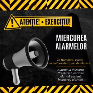 Astăzi, între orele 10:00-11:00, va avea loc exercițiul de alarmare publică, denumit generic “MIERCUREA ALARMELOR”. Astfel, sirenele din județ vor emite semnalul „Alarmă la dezastre”, care presupune iminența producerii unor calamități cu impact major asupra comunităților. Semnalul este compus din 5 sunete a câte 16 secunde fiecare, cu pauză de 10 secunde între ele.