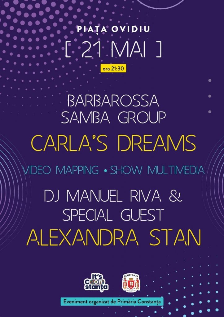 Sâmbătă, începând cu ora 21:30, vor urca pe scena din Piața Ovidiu: BARBAROSSA SAMBA GROUP, CARLA’S DREAMS, DJ MANUEL RIVA și ALEXANDRA STAN.