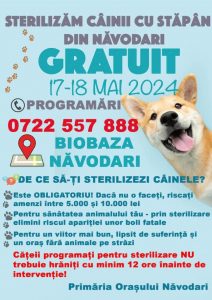 Reamintim că sterilizarea câinilor de rasă comună și metis este obligatorie, iar nerespectarea prevederilor legale se amendează cu sume cuprinse între 5.000 și 10.000 Lei.