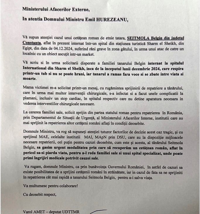 Deputatul Varol Amet, reprezentant al comunității tătare din Parlamentul României, face un apel urgent către ministrul Emil Hurezeanu, Ministerul Afacerilor Externe (MAE) și Guvernul României pentru a interveni rapid și eficient în vederea salvării vieții unui tânăr de etnie tătară aflat într-o situație critică într-un spital din Sharm el-Sheikh, Egipt.