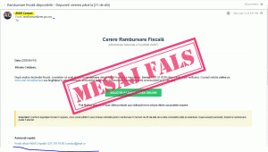 ANAF atenționează contribuabilii cu privire la o nouă campanie de emailuri false (email spoofing*) transmise în numele instituției, prin care contribuabilii sunt înștiințați că ”au dreptul la rambursare datorită plății în exces a impozitelor”.