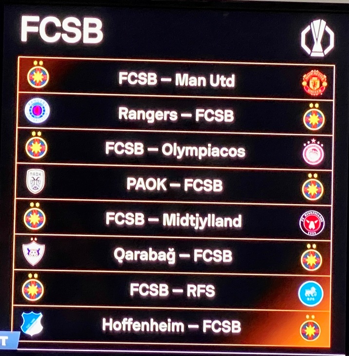 FCSB și-a aflat cele 8 adversare din Europa League: Manchester United, Rangers,PAOK, Olympiacos, Qarabag, Midtjylland, Hoffenheim și RFS.