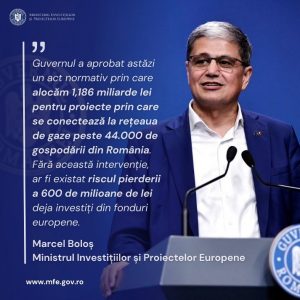 „Prin această măsură, salvăm 18 proiecte esențiale care vor aduce gaz în casele a peste 44.000 de gospodării din România. Vorbim despre comunități unde situația este dificilă, unde oamenii încă sunt nevoiți să depoziteze lemne în apartamente sau să îndure frigul iernilor grele. Fără această intervenție, ar fi existat riscul pierderii a 600 de milioane de lei deja investiți din fonduri europene, bani care ar fi trebuit returnați cu dobânzi. Mai mult, proiectele ar fi rămas nefinalizate, iar oamenii nu ar fi beneficiat de infrastructura pentru care s-au făcut eforturi majore. De aceea, am decis alocarea a 1,186 miliarde de lei pentru a sprijini finalizarea acestor lucrări, oferind localităților o alternativă viabilă la încălzirea cu lemne și contribuind la reducerea emisiilor de gaze cu efect de seră”, a subliniat ministrul Marcel Boloș.