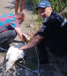 Jandarmii constănțeni s-au deplasat la fața locului și au constatat faptul că lebăda se agățase într-un cîrlig de pescuit iar nylonul atașat de cârlig i se înfășurase în jurul gâtului și al corpului, imobilizându-i o aripă și unul dintre picioare. Cu ajutorul unui mincioc de pescuit jandarmii au reușit să captureze lebăda iar apoi i-au desfăcut cârligul și nylonul din jurul corpului. Lebăda a fost eliberată și s-a întors alături de cei trei puișori ai săi, care au fost spectatori la intervenția jandarmilor