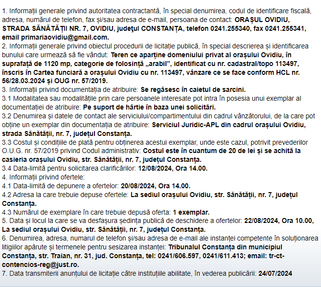 Home/Stiri/Licitație publică: Teren ce aparține domeniului privat al orașului Ovidiu, în suprafață de 1120 mp, categorie de folosință „arabil”, identificat cu nr. cadastral/topo 113497, înscris în Cartea funciară a orașului Ovidiu cu nr. 113497, vânzare ce se face conform HCL nr. 56/28.03.2024 și OUG nr. 57/2019