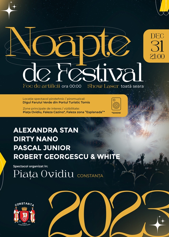 Alexandra Stan, Dirty Nano, Pascal Junior și Robert Georgescu & White vor crea o atmosferă de neuitat în Piața Ovidiu în noaptea dintre ani. Evenimentul organizat de Primăria Municipiului Constanța va debuta la ora 21:00. Cei care doresc să întâmpine Anul Nou în Piața Ovidiu vor avea parte de un show deosebit de lasere, iar la miezul nopții un superb spectacol de artificii va anima cerul Constanței. Focurile de artificii vor fi lansate de pe Digul Farului Verde din Portul Turistic Tomis. Efectele pirotehnice vor fi sincronizate cu o coloană muzicală personalizată.