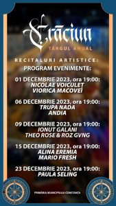 Vă invităm să descoperiți atmosfera de sărbătoare și să vă bucurați de surprizele pregătite atât pentru cei mari, cât și pentru cei mici. Nu vor lipsi concertele, atelierele distractive, căsuța lui Moș Crăciun, colindele, trenulețele, dar și numeroasele standuri cu produse artizanale și cu idei de cadouri pentru toți cei dragi.