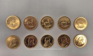 Acționând în baza unei analize de risc, a fost efectuat un control amănunțit asupra bagajelor de mână ale persoanei în cauză, fiind astfel descoperite zece monede, confecționate din metal de culoare galbenă, inscripționate Suid Afrika- South Africa.