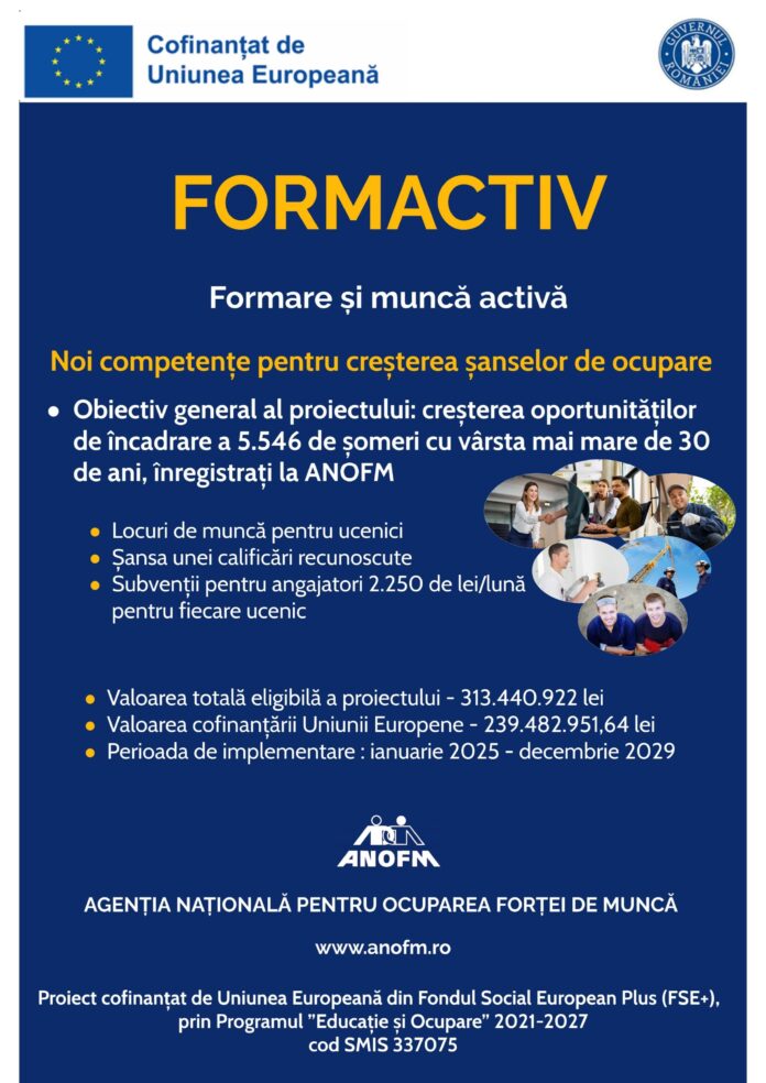 Programul este implementat prin Agenția Națională pentru Ocuparea Forței de Muncă, cofinanțat de Uniunea Europeană prin Fondul Social European +, în vederea creșterii șanselor de ocupare a persoanelor aflate în căutarea unui loc de muncă.