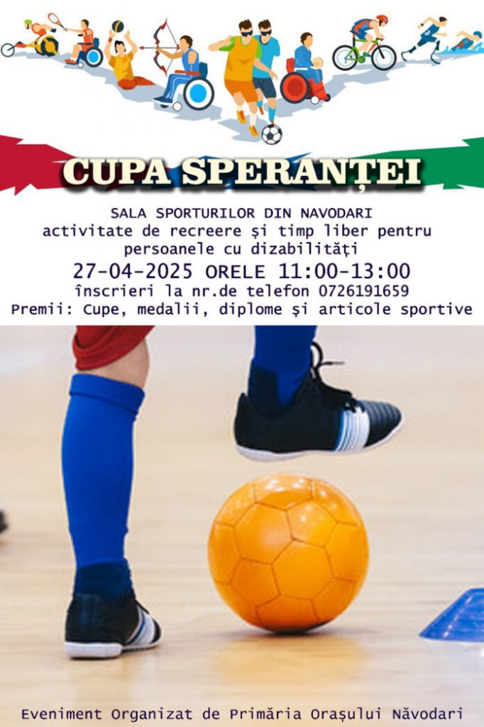 Primăria Orașului Năvodari organizează duminică, 27 aprilie 2025, între orele 11:00 – 13:00, la Sala Sporturilor din Năvodari, „Cupa Speranței”, Ediția I – o activitate de recreere și timp liber dedicată persoanelor cu dizabilități.