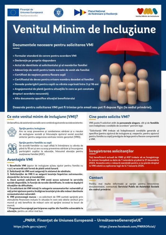 Venitul minim de incluziune (VMI) reprezintă un program unic de asistență socială, creat pentru a ajuta persoanele și familiile vulnerabile să depășească obstacolele financiare pe care le întâmpină și să-și îmbunătățească viața. VMI este un beneficiu prevăzut în Legea nr. 196/2016 privind venitul minim de incluziune și are două componente: