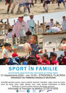 Toți copiii și părinții din orașul Năvodari sunt așteptați, duminică, 1 septembrie, la o nouă activitate sportivă de recreere și timp liber, care va avea loc pe Stadionul Flacăra, începând cu ora 10.00. ”Sport în familie” este o invitație de petrecere a timpului în familie, prin antrenarea în activitățile sportive preferate. Oferta disciplinelor sportive este bogată: baschet, handbal, rugby, tenis de masă, tenis de câmp, judo, lupte, kempo, box, volei, fotbal!