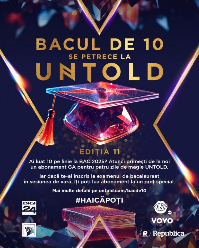 În plus, toți cei înscriși la sesiunea de vară a Bacalaureatului beneficiază de un discount de 40 de euro la achiziționarea unui abonament la ediția aniversară UNTOLD, valabil până la 30 iulie.