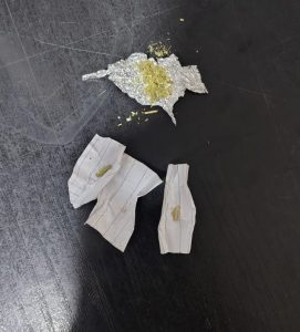 În urma controlului, jandarmii au descoperit asupra tânărului un pachețel de staniol în care se afla o substanță vegetală, de culoare verde-oliv, cu miros specific și alte trei pachețele de hârtie care conțineau resturi din aceeași substanță.