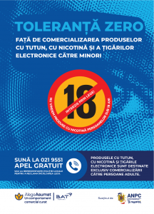 BAT in parteneriat cu Autoritatea Nationala pentru Protectia Consumatorilor (ANPC), demareaza luna aceasta campania anuala „Alege Asumat un Comportament Comercial Curat”. Aceasta initiativa urmareste sa informeze si sa sensibilizeze opinia publica cu privire la importanta respectarii legislatiei pentru prevenirea accesului minorilor la produsele din tutun si nicotina. Anul acesta, legislatia in domeniu a suferit modificari importante, concepute pentru a reduce riscul ca minorii sa aiba acces la astfel de produse. Printre aceste modificari se numara extinderea interdictiei de comercializare catre minori a tigaretelor electronice, indiferent daca acestea contin nicotina sau nu, si interdictia de a comercializa produsele din tutun si nicotina prin automate.