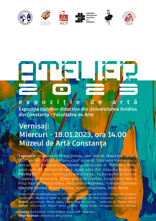 Facultatea de Arte din cadrul Universităţii Ovidius din Constanţa (UOC) şi Muzeul de Artă Constanţa organizează miercuri, 18 ianuarie 2023, vernisajul expoziției „Atelier 2023”.