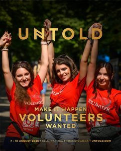 Peste 2.000 de persoane cu vârsta de peste 16 ani, sunt așteptate să se alăture echipei de voluntari pentru ediția aniversară UNTOLD X. Perioada de înscriere este deschisă între 30 mai și 22 iunie, prin completarea unui formular online: https://forms.gle/4C4ymZSb3TVScNgL6 [1]