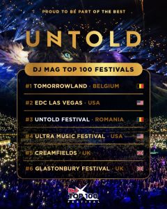 În 2024, UNTOLD festivalulul care a pus România pe harta celor mai mari evenimente din lume, încă de la prima ediție în 2015, ocupă locul 3 în clasamentul cele mai impresionante festivaluri organizate la nivel internațional. Festivalul din Cluj-Napoca, ajuns la a 9-a ediție, a reușit să se poziționeze ca unul dintre cele mai importante evenimente muzicale internaționale. Aflat acum în compania selectă a marilor festivaluri precum Tomorrowland din Belgia și EDC (Las Vegas), acest festival continuă să atragă cel mai frumos public din lume, artiști și DJ de top, consolidându-și reputația pe scena globală a industriei de evenimente.